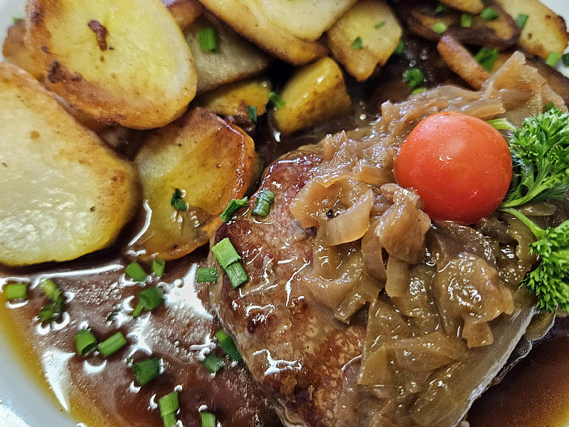 • Zwiebelrostbraten mit Bratkartoffeln oder hausgemachten Spätzle